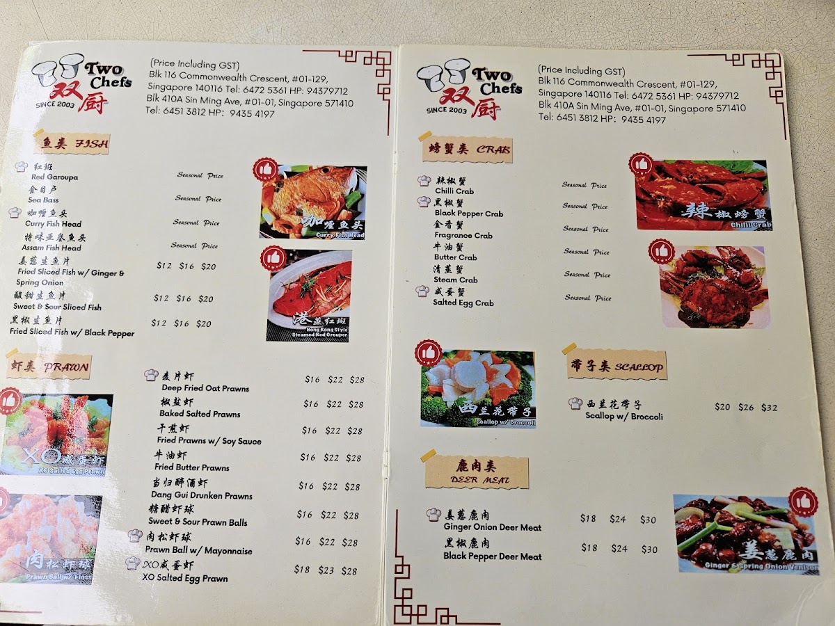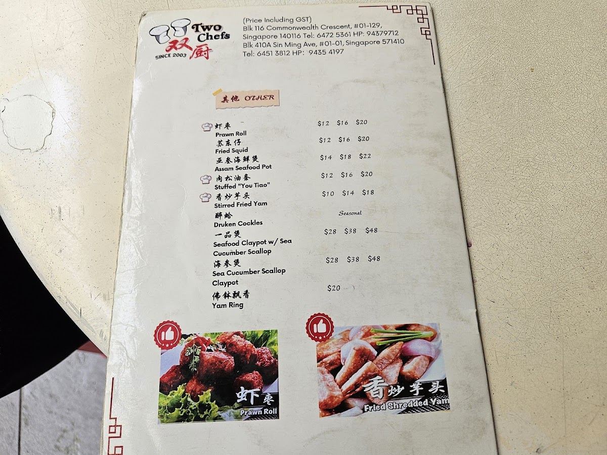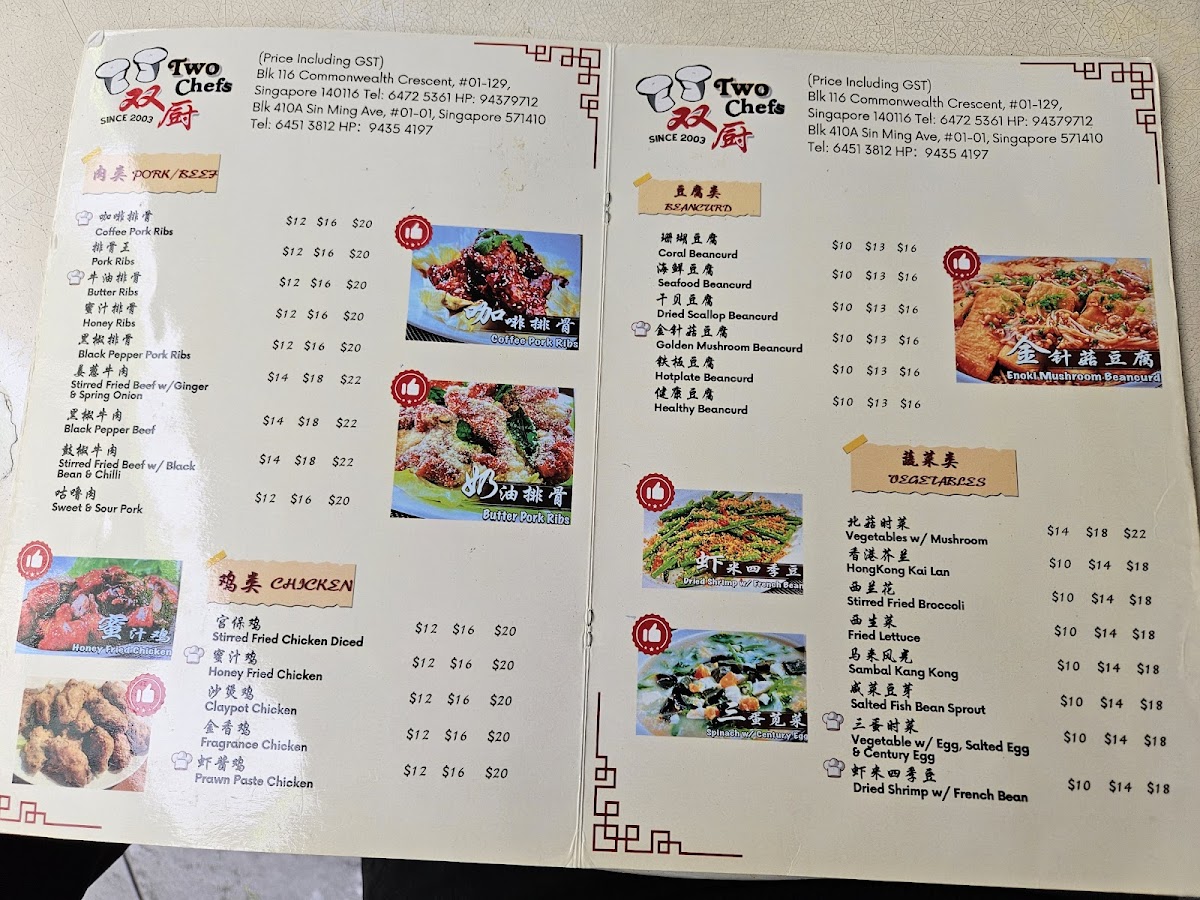 The menu at Two Chefs Eating Place offers a comfortable and familiar range of Chinese dishes, typical of a casual zi char-style eatery where the focus is on hearty, well-executed flavors. You’ll find a variety of comforting mains, from classic pork ribs prepared in unique ways like butter or milk powder, to fresh seafood options such as Hong Kong style steamed red snapper and deep-fried oat prawns.