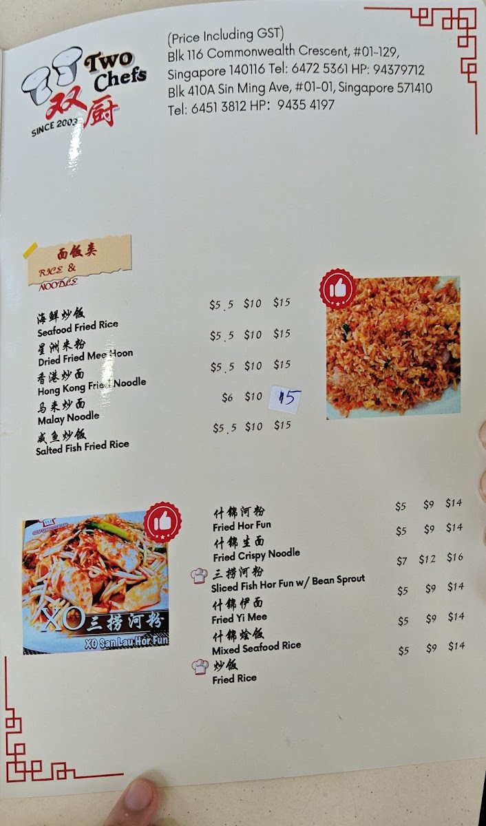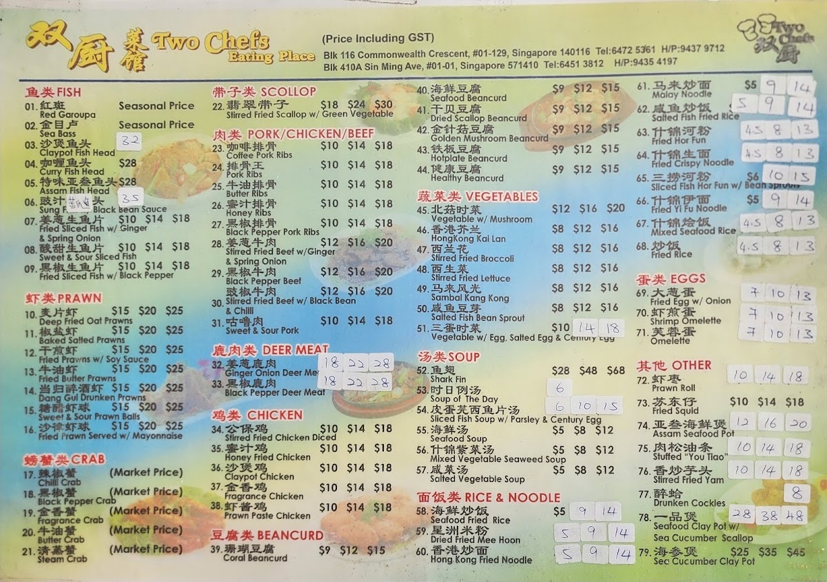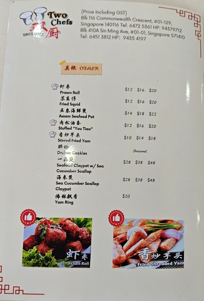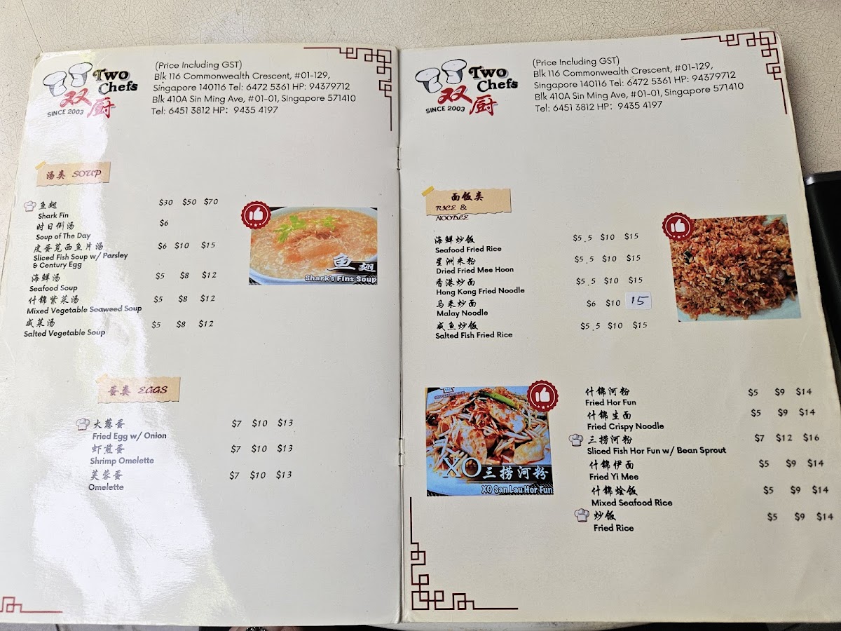 The menu at Two Chefs Eating Place offers a comfortable and familiar range of Chinese dishes, typical of a casual zi char-style eatery where the focus is on hearty, well-executed flavors. You’ll find a variety of comforting mains, from classic pork ribs prepared in unique ways like butter or milk powder, to fresh seafood options such as Hong Kong style steamed red snapper and deep-fried oat prawns.